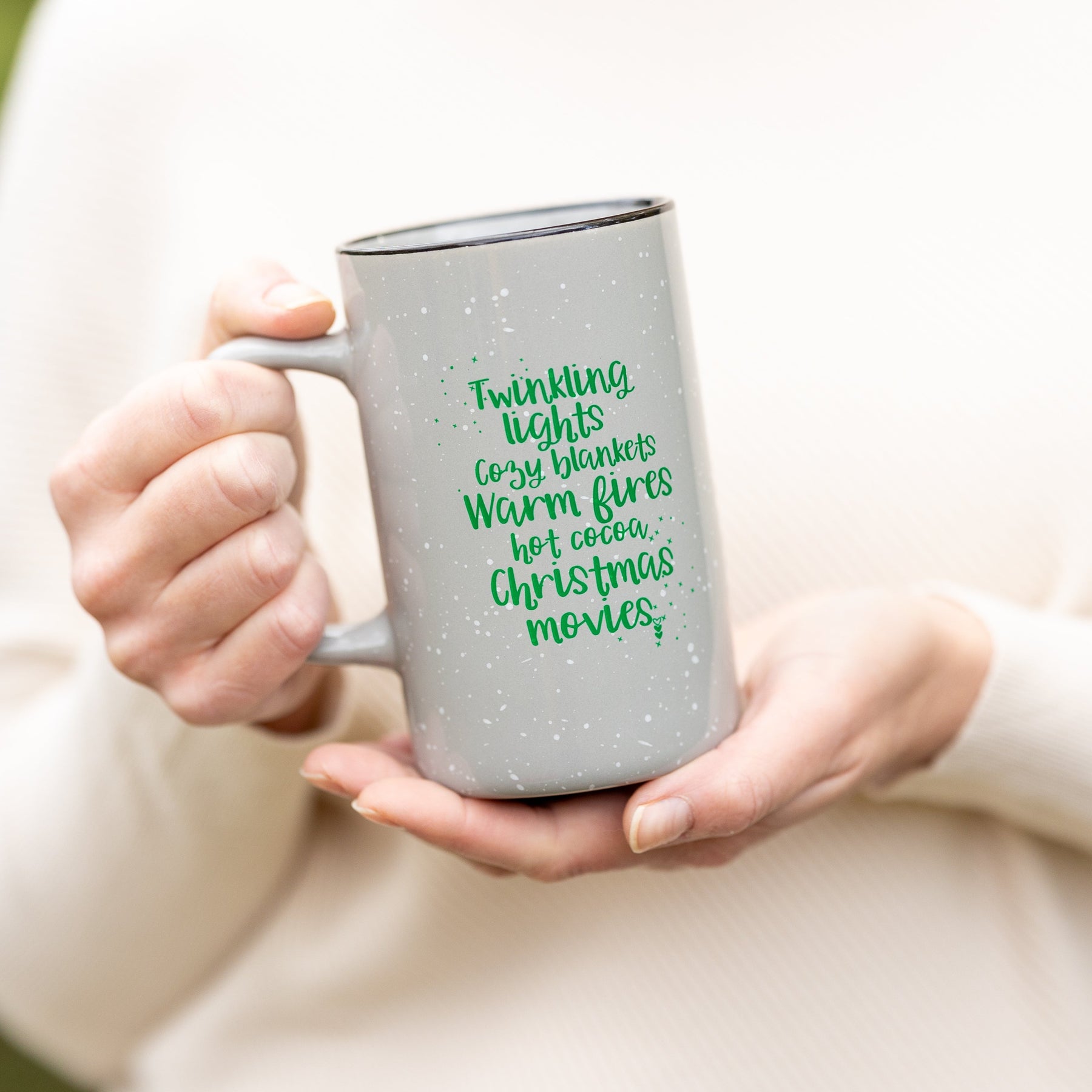 A purple ceramic coffee mug with white speckles and text design, placed on a grey surface next to a white blanket and a Christmas tree in the background.