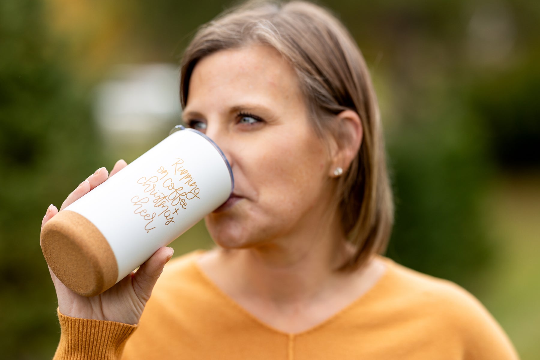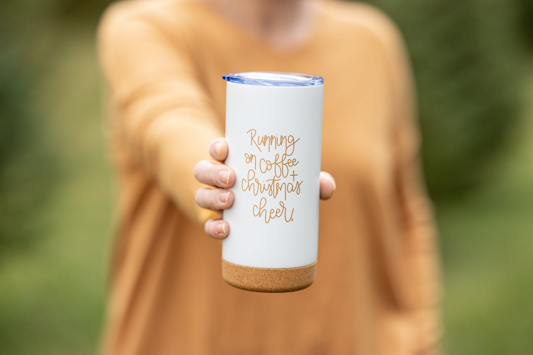 This festive hand lettered, double wall, stainless steel travel mug is the one you will want to grab from your kitchen cupboard before heading out the door for holiday shopping, traveling, work, or, let's be honest, any excuse to get out of the house....am I right on that?! It's a beautiful matte white with gold metallic writing, has a cork bottom, a lid and is vacuum insulated, so it's perfect for hot and cold drinks. Perfect for the mama-on-the-go, who loves the holiday season!